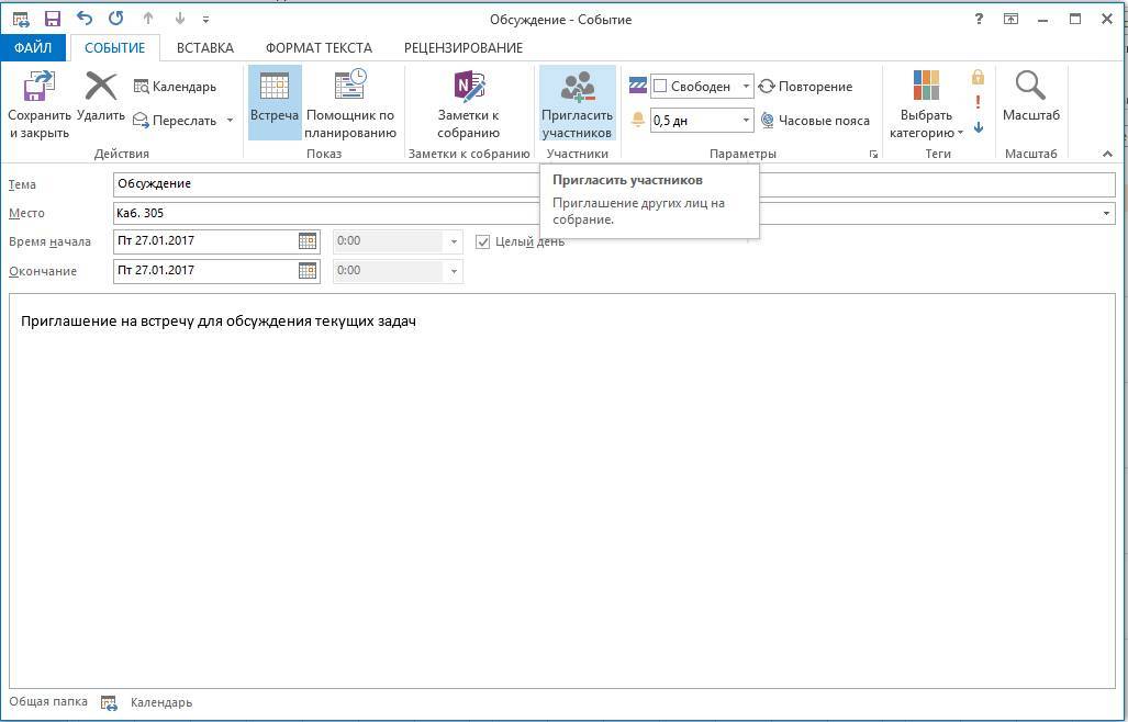 Если предстоит совещание, в котором обязательно должны принять участие и другие коллеги, можно воспользоваться функцией «Пригласить участников».