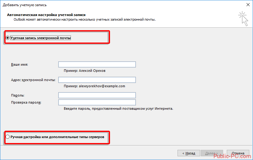 Тут же доступен раздел «Ручная настройка или дополнительные типы серверов». Выбрав этот пункт, вы сможете вручную ввести типы (POP3 или IMAP) и указать адреса серверов входящей и исходящей почты, а также настроить порты для доступа к ним. Этот пункт стоит выбрать при настройке корпоративной почты или почты зарегистрированной на отдельных серверах с разным типом шифрования.