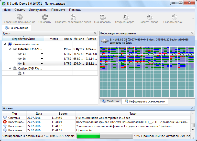 Если вы хотите восстановить все данные, нужно просканировать нужный раздел, чтобы обнаружить все файловые системы, которые там были и с которыми может работать утилита. Для этого выберите нужный раздел и нажмите кнопку «Сканировать». Этот процесс может занять длительное время, прогресс будет отображаться в правой части рабочей области: