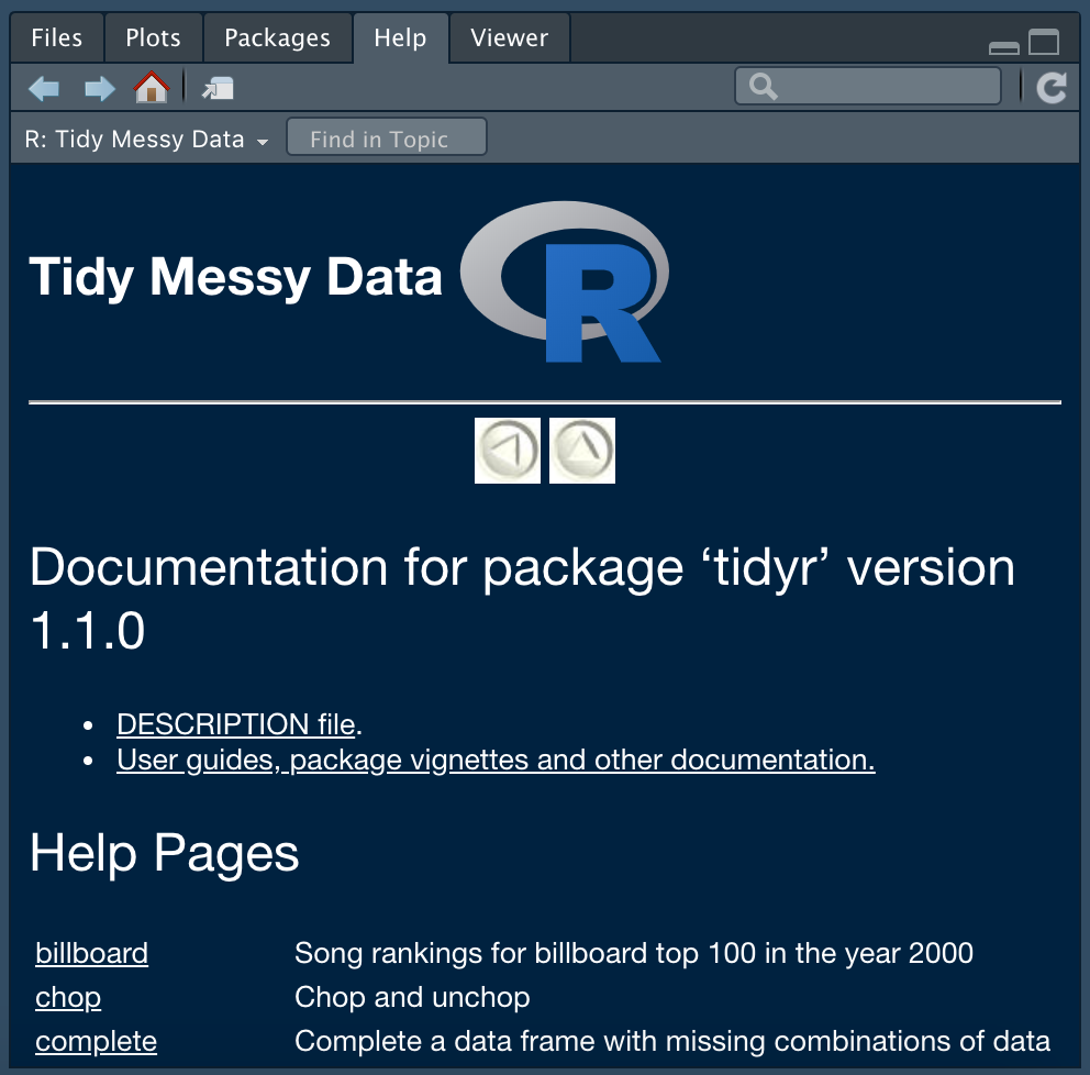 The help page for a package provides quick access to documentation for each function included in a package. From the main help page for a package you can also access “vignettes” when they are available. Vignettes provide brief introductions, tutorials, or other reference information about a package, or how to use specific functions in a package.