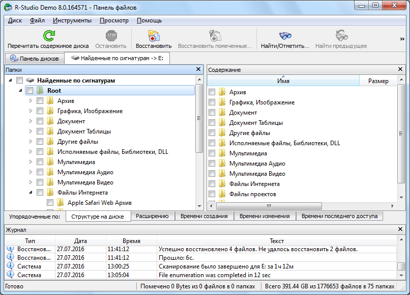 После непродолжительной обработки данных, открывается список найденных файлов. Они сгруппированы в отдельные папки по типу контента (архивы, мультимедиа, графика и т.д.).