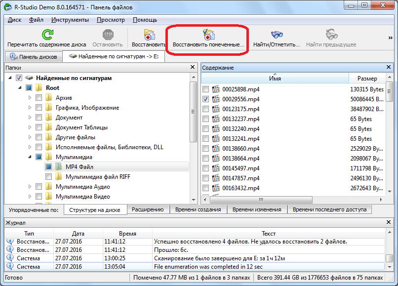 Восстанавливаем данные, как и в предыдущий раз: отмечаем нужный файл или папку галочкой, и жмем на кнопку «Восстановить помеченные» в панели инструментов.