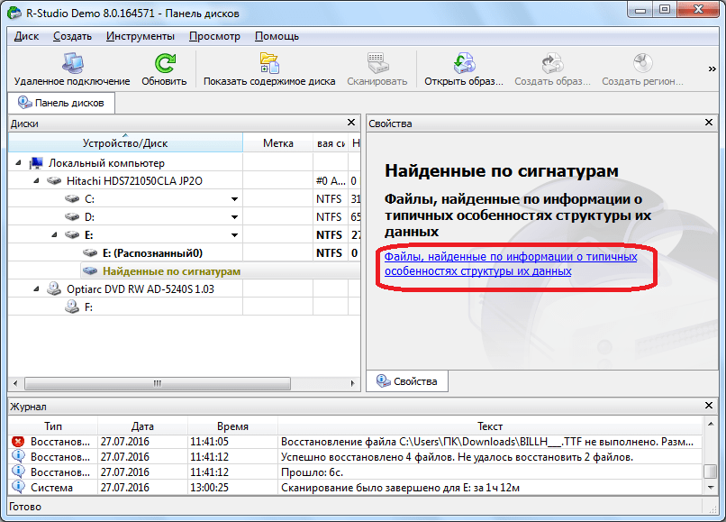 Если во время просмотра диска вы не нашли нужную вам папку или файл, то это значит, что их структура уже была нарушена, вследствие записи поверх удаленных элементов новых файлов, или произошло аварийное нарушение структуры самого диска. В этом случае, простой просмотр содержимого диска не поможет, и нужно проводит полноценное сканирование по сигнатурам. Для этого, выбираем нужный нам раздел диска, и жмем на кнопку «Сканировать».
