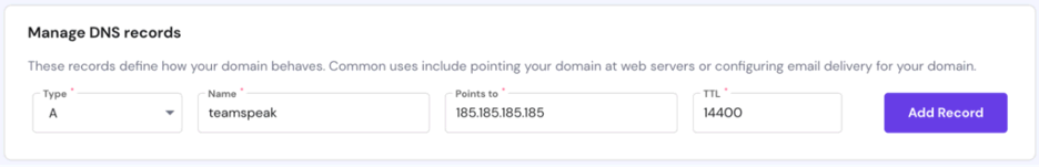 In the Manage DNS records section, proceed to create a subdomain and direct it to your TeamSpeak server.
