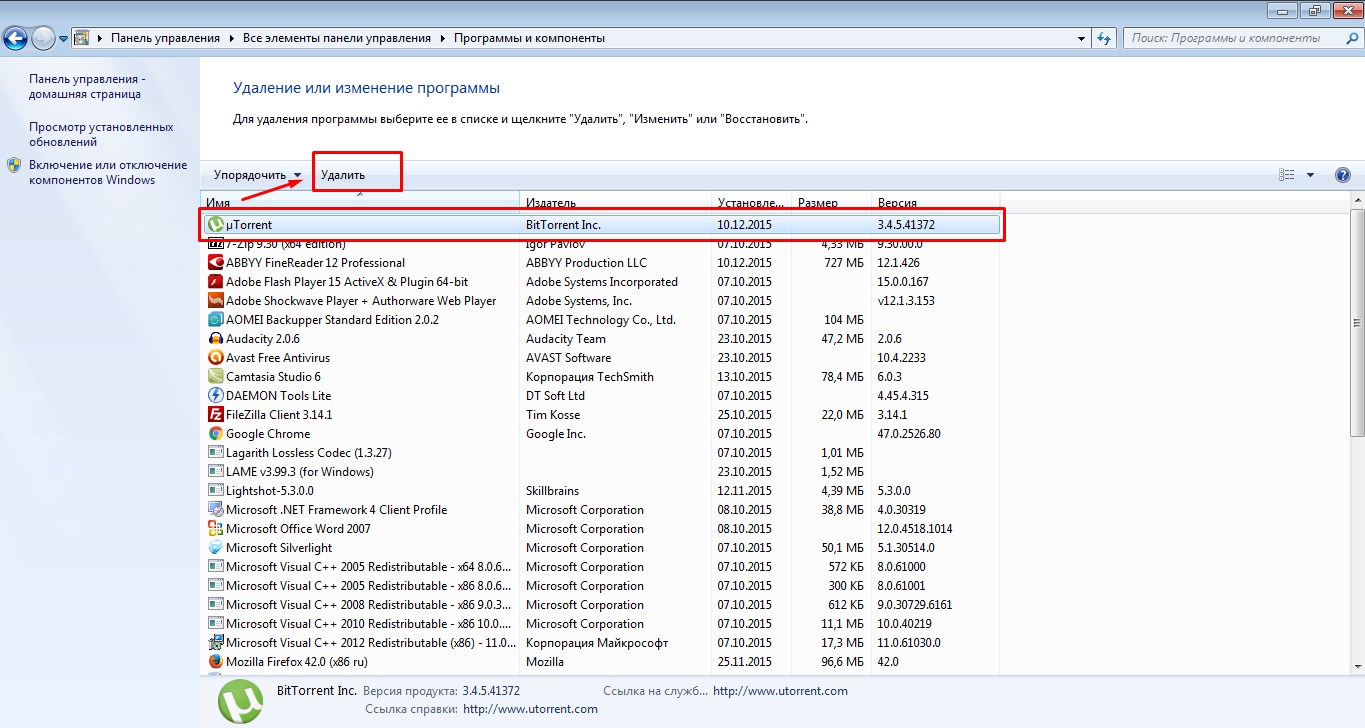Перед вами откроется окно в котором будут показаны все ваши программы, среде них находим приложение uTorrent, выбираем его и нажимаем кнопку удалить. Соглашаемся с удалением и все — программа удалена.