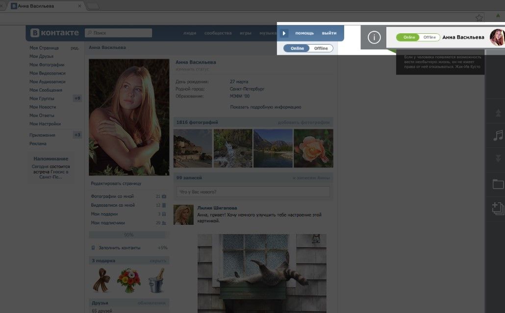 Существуют два сервиса, с помощью которых можно находится на своей страничке в социальной сети вконтакте, быть активным, читать новости, публиковать посты, просматривать всю необходимую информацию, слушать музыкальные композиции, однако для остальных пользователей и своих друзей находится всегда в режиме оффлайна.