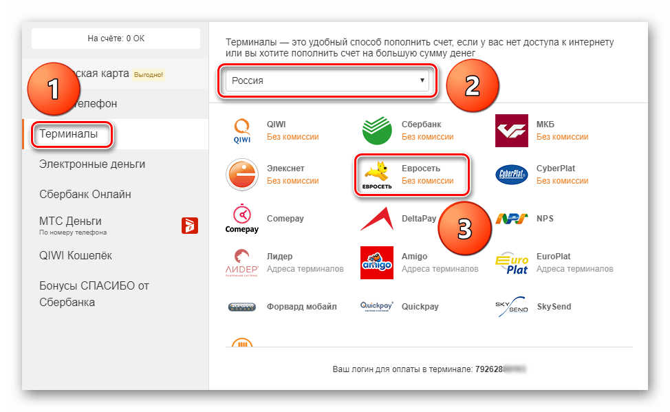 Затем найдите требуемый терминал. На экране выберите вкладку «Оплата услуг», а после «Социальные сети», «». В появившемся окне следует ввести логин, который был выдан на сайте. Необходимо правильно набрать его, поскольку в противном случае средства могут уйти кому-то другому. Лучше всего будет несколько раз проверить символы.
