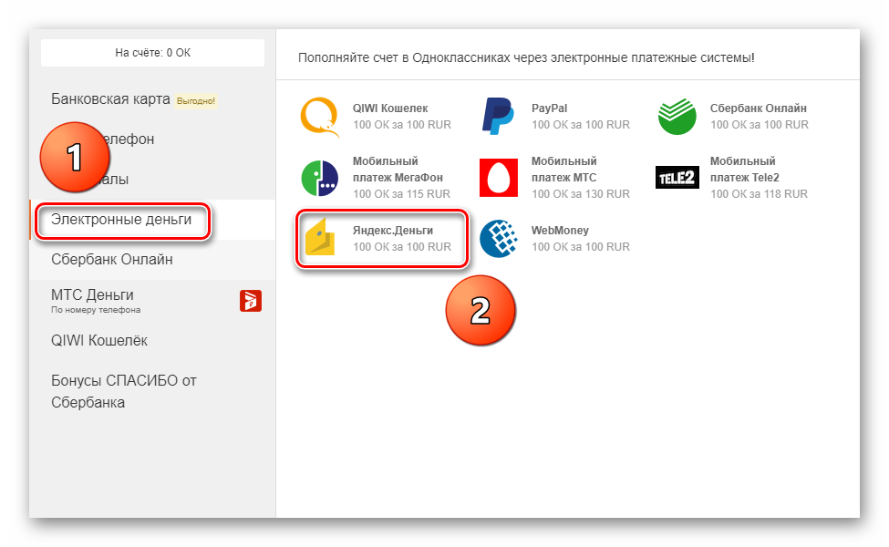 Социальная сеть также предоставляет возможность пополнить ОКи с баланса электронного кошелька. Для этого в окне пополнения выберите «Электронные деньги». Можно использовать все популярные сервисы в виде QIWI, WebMoney, PayPal и Яндекс.Деньги.
