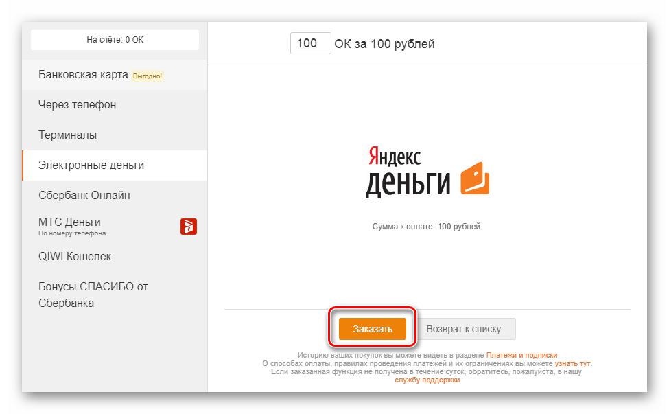 - В следующем окне пользователю будет предложен способ оплаты. Самый выгодный вариант – банковская карта, поскольку она позволяет оплатить без процентов. Каждый ОК стоит 1 рубль.