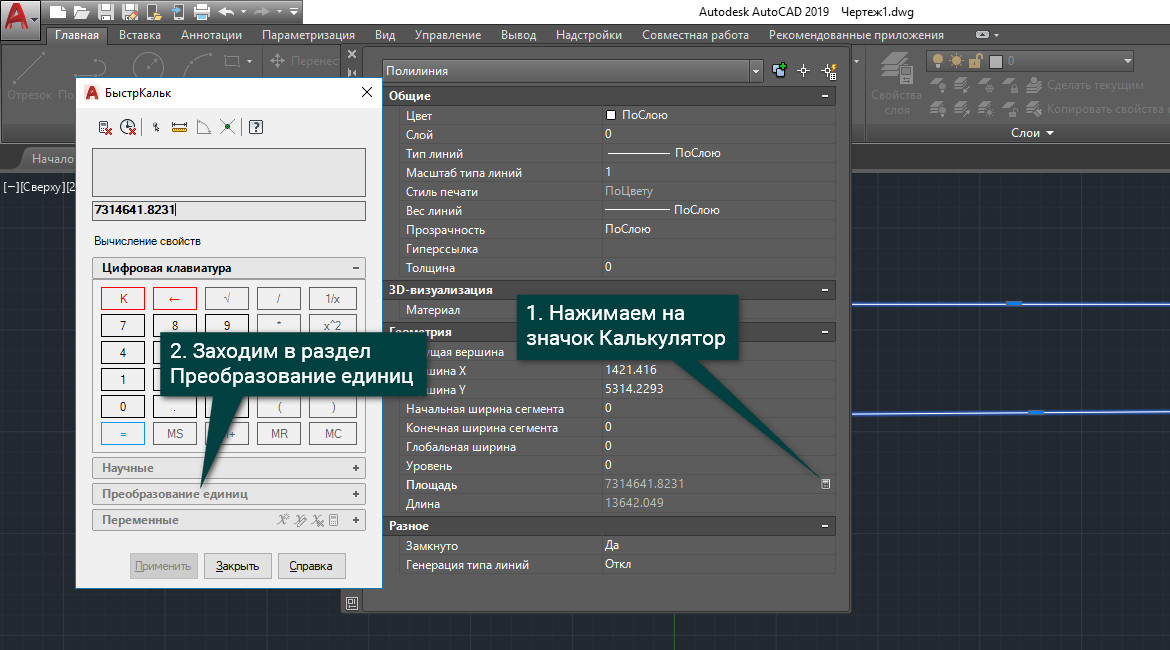 Журнал командной строки можно несколько увеличить, путем растягивания его границ с помощью мышки. Далее находим нужное значение площади/периметра, копируем его (Ctrl+C) и вставляем значение в калькулятор. Здесь следует немного поработать со списком «Преобразование единиц» (см. рис.).