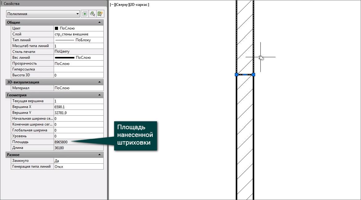 Шаг 1. Штрихуем наши несущие стены, выделяем штриховку и кликаем правой кнопкой мышки, выбираем “свойства”. Здесь нам опять интересует пункт “геометрия”, где в строке “площадь” будет указана общая площадь внутренней стены.