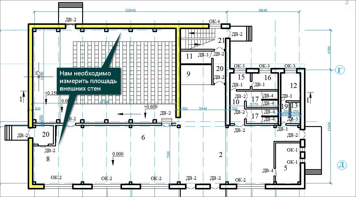 Теперь рассмотрим более динамичный и интерактивный подход определения площади. У нас есть план 1 этажа, и мы хотим измерить площадь наружних стен, которые построены при помощи полилиний и отдельных отрезков.