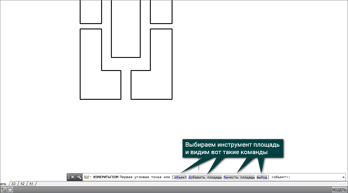 Теперь рассмотрим суббопции подсчета площадей. Выбрав инструмент площадь, в командной строке мы увидим такие команды: Объект, Добавить площадь, Вычесть площадь, Выход.