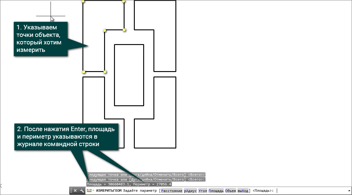 чтобы измерить площадь, нам необходимо указать все точки объекта. По окончании нажимаем Enter и устремляем свой взор на журнал командной строки. Видим, что площадь указана огромным числом, но не пугайтесь, это в квадратных миллиметрах, так же рядом указано значение периметра.