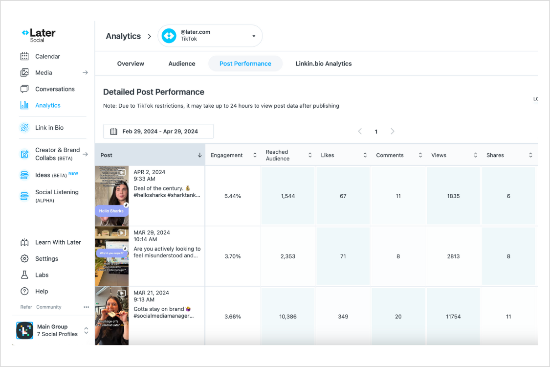 Later’s TikTok Analytics feature lets you view up to 12 months worth of data (dependent on your plan), all in an easy-to-use dashboard.