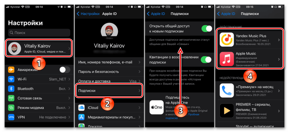 Альтернативный вариант: в настройках мобильной ОС откройте раздел управления учетной записью Apple ID (первый пункт в списке, с изображением фото вашего профиля), перейдите в «Подписки» и прокрутите немного вниз.