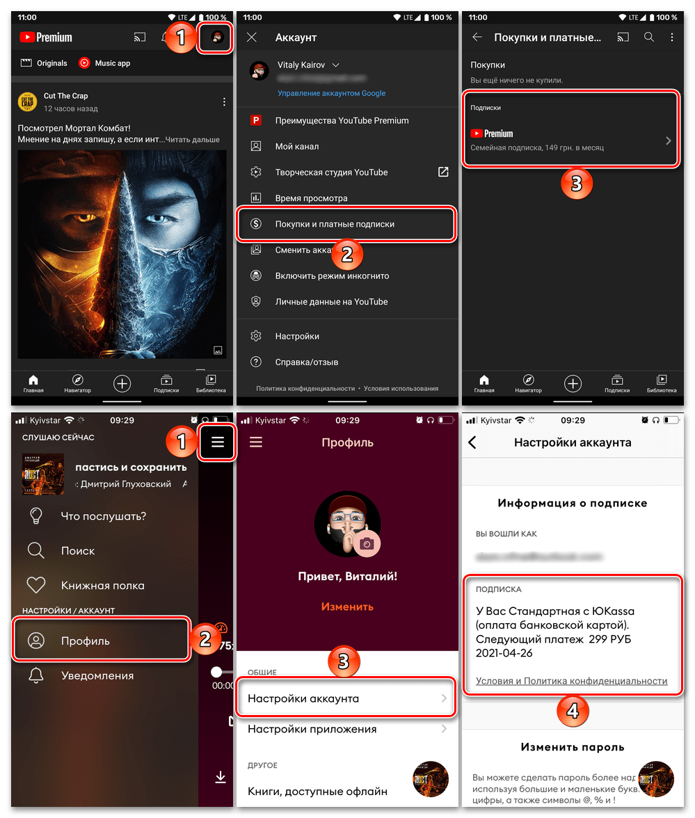 В обоих случаях для просмотра сведений потребуется выполнить примерно следующее (примерно – потому как ввиду существенных различий в интерфейсах мобильных программ универсальную инструкцию предложить невозможно): в меню или настройках, или на навигационной панели перейдите к разделу управления своим профилем (обычно там отображается фото или заменяющая его миниатюра) и найдите пункт, в названии которого фигурирует слово «Подписка». Несколько наглядных примеров показаны на изображениях выше и ниже.