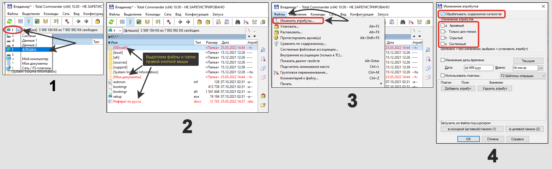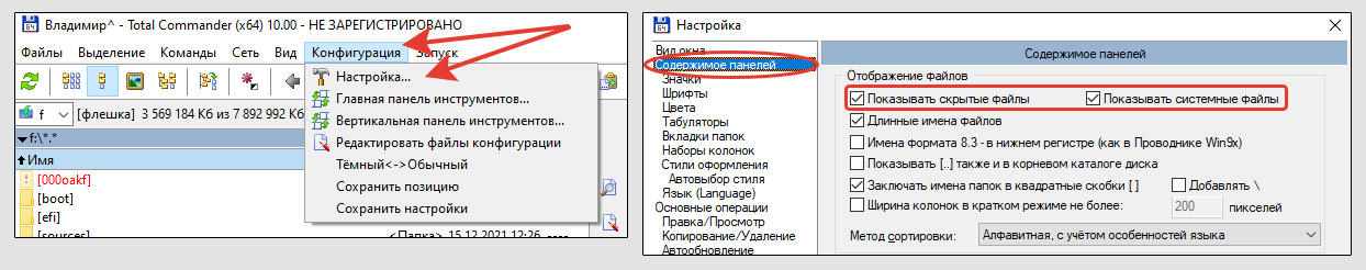 Отображение скрытых объектов на флешке через Total Commander