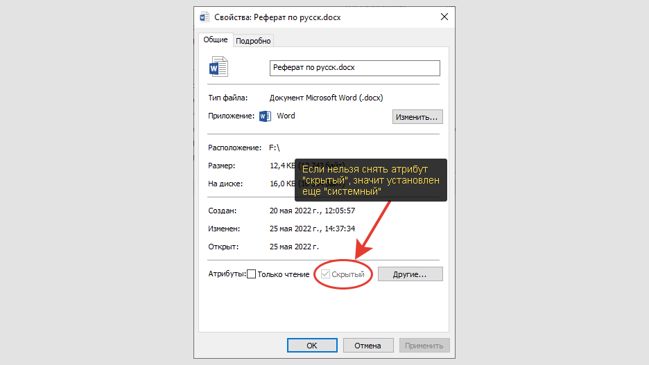 Снимите галочки напротив атрибутов «Скрытый» и «Системный». Нажмите «ОК».