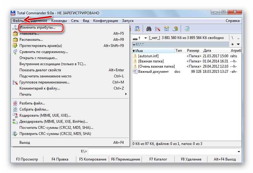 Теперь, открыв в Тотал Коммандере флешку, Вы увидите ее содержимое. Как видите, все достаточно просто. Дальше все также выполняется достаточно легко. Выделите все нужные объекты, откройте категорию «Файл» и выберите действие «Изменить атрибуты».