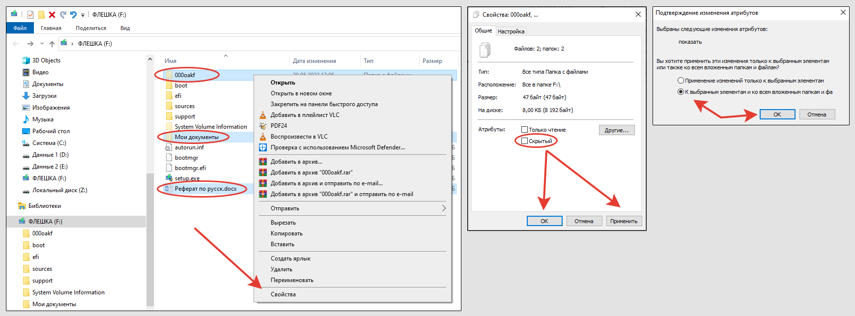 Заключительный этап — сделать все наши файлы и папки на флешке снова видимыми в системе, без обязательного включения показа скрытых элементов.