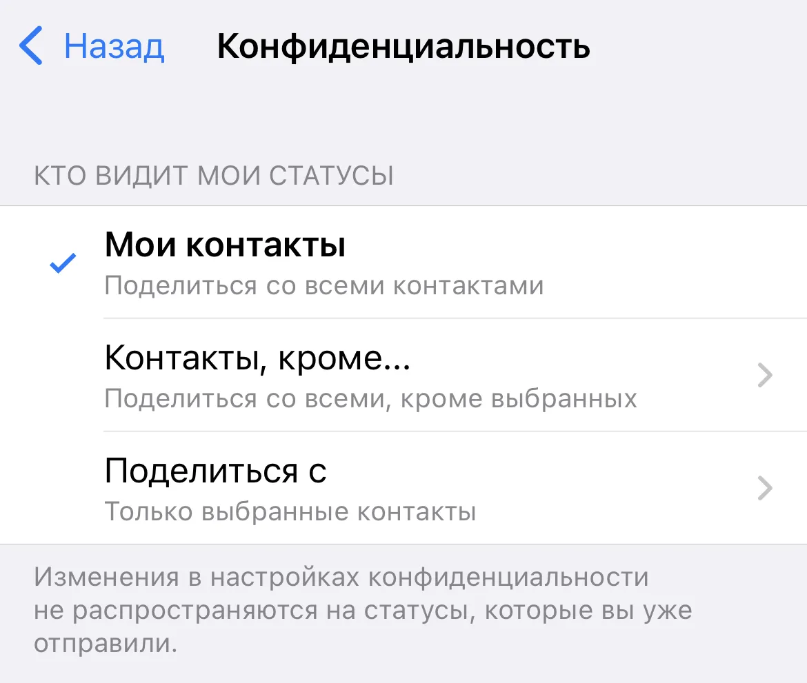 Сразу после редактирования исходных материалов и незадолго до публикации статуса, WhatsApp еще раз напомнит о возможности разграничить общение и заглянуть в настройки приватности