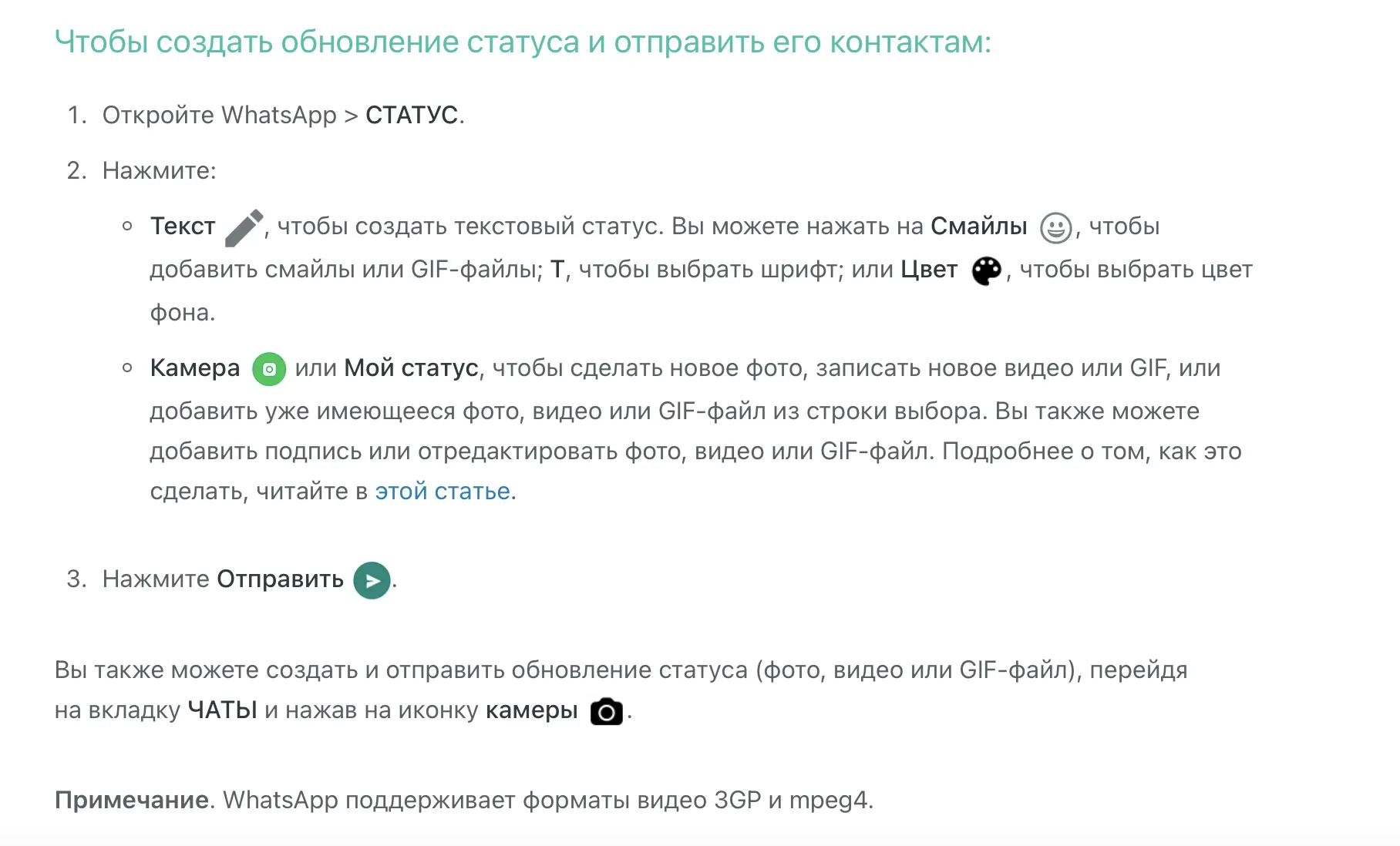 Публикация статуса — дело нескольких секунд. Туториал можно найти на официальном сайте WhatsApp. Вот так он выглядит: