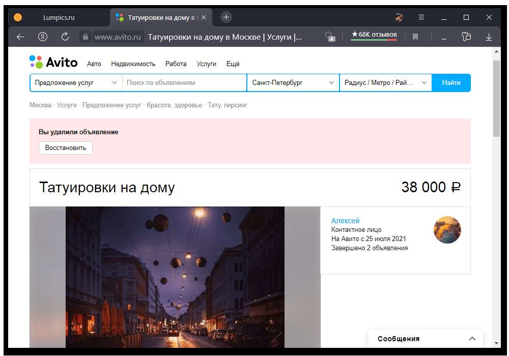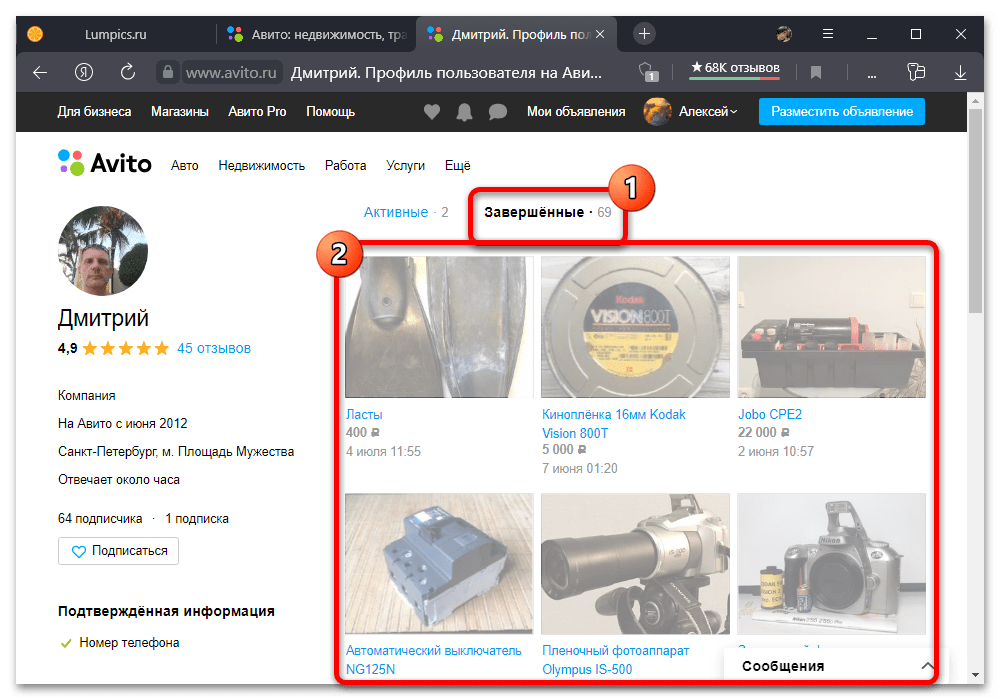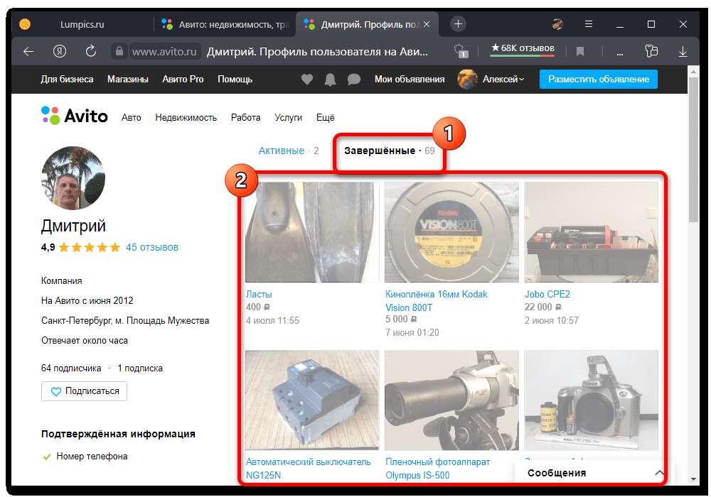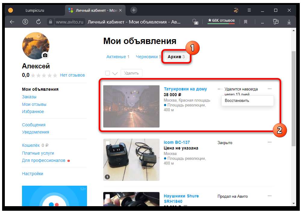 Просмотр завершенных объявлений на Авито