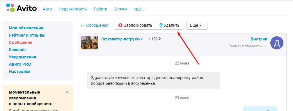 Как удалить сообщение на Авито