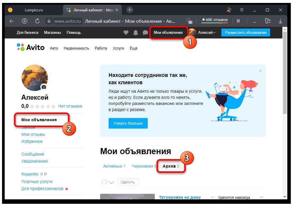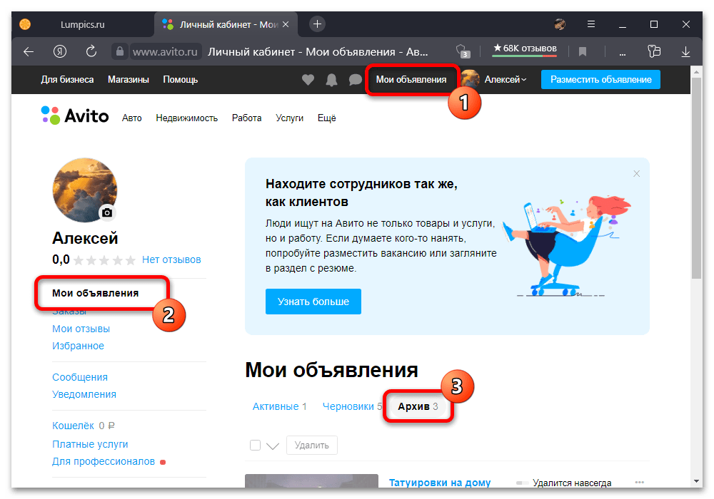 - На панели в верхней части официального веб-сайта торговой площадки нажмите кнопку «Мои объявления» для перехода в личный кабинет. После этого в рамках одноименного блока следует выбрать подраздел «Архив», содержащий удаленные и закрытые публикации.