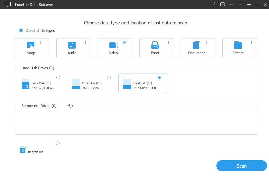 Скачать и установить FoneLab Data Retrieverи запустите программное обеспечение после успешной установки, выберите тип файла и точное местоположение видео, Затем нажмите Сканирование, Если вы забыли, где хранится видео, вам нужно сканировать один жесткий диск за раз.