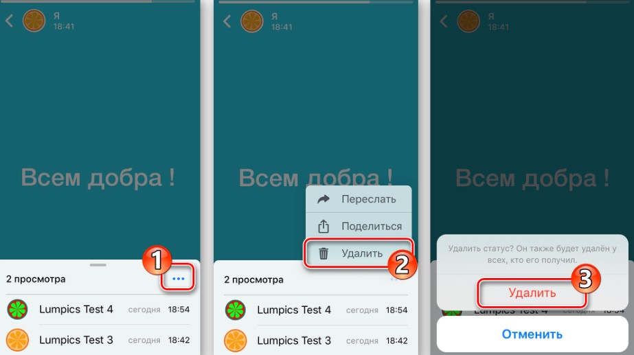 Доступна в WhatsApp и расширенная статистика. Подробности раскрываются в том случае, если после троеточия нажать на иконку собственного статуса. Мессенджер еще раз воспроизведет контент, а снизу добавит специальную иконку с количеством зрителей. Если на иконку нажать, то WhatsApp продемонстрирует еще и конкретные имена друзей и контактов, недавно взаимодействовавших со статусом. Там же появятся кнопки для быстрого обмена контентом (кнопка «Поделиться»), а заодно и кнопка «Удалить».
