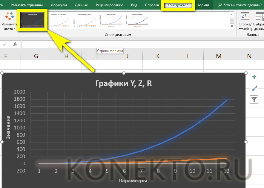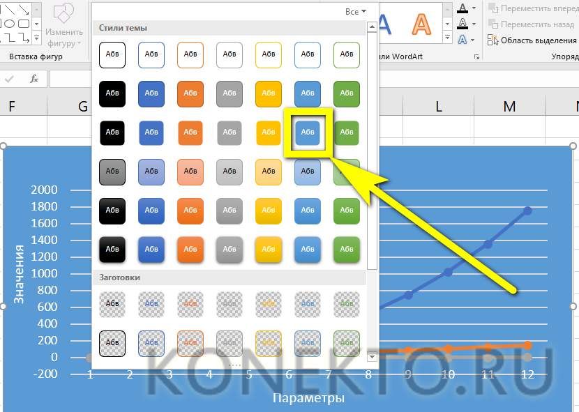 - В открывшемся меню выбираем любой стиль. Программа предлагает выбрать диапазон для таблицы – соглашаемся с его вариантом. Получаем следующий вид значений для диаграммы: