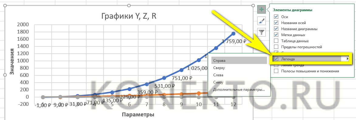 В диаграммах эксель имеется опция настройки легенды – изменения месторасположения, отобразить её или скрыть.
