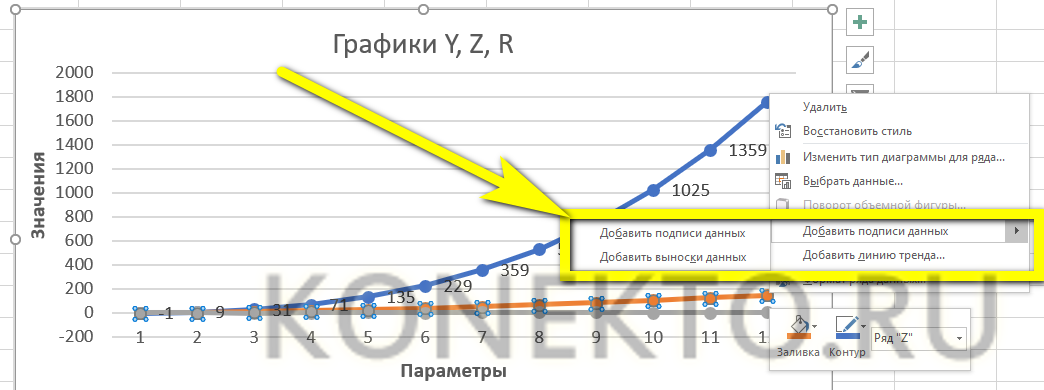 Добавление подписей данных. Нормальным дополнением к столбиковым диаграммам являются подписи данных. Хотя пользователям довольно легко сравнивать длины столбцов и измерять приблизительные значения по столбчатой диаграмме, точные значения не всегда легко выявить. Подписи данных могут показывать эти значения там, где они важны. Подпись данных обычно размещают в середине столбика, либо сверху на конце.