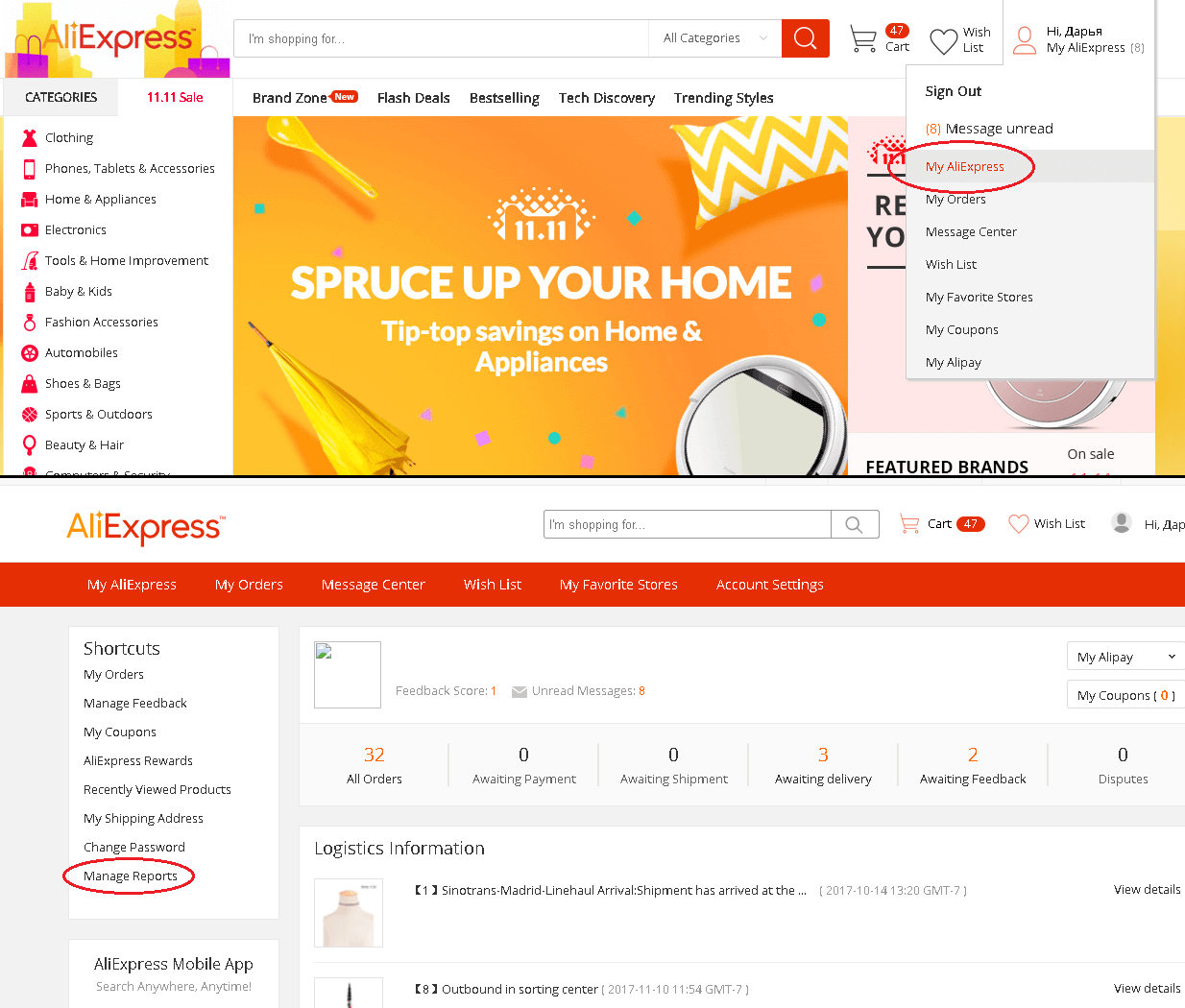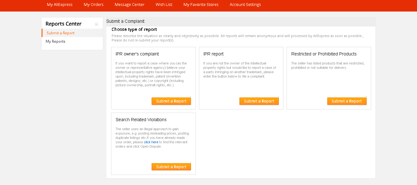 Торговая площадка «Алиэкспресс» реализует возможность подачи претензии только на определенные категории деятельности сайта. Все они перечислены в разделе «My Aliexpress» и одном из представленных в нем, самом последним по счету, подпункте – «Управление жалобами» («Manage Reports»).