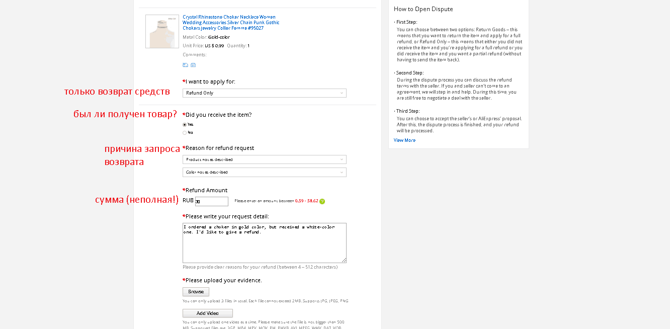 Обратите внимание, что в качестве доказательств могут быть предоставлены фото, видео или описание — без них администрация даже не станет рассматривать спор. В большинстве случаев от покупателя все же требуют видео с распаковкой посылки, чтобы можно было убедиться, что покупатель не врет