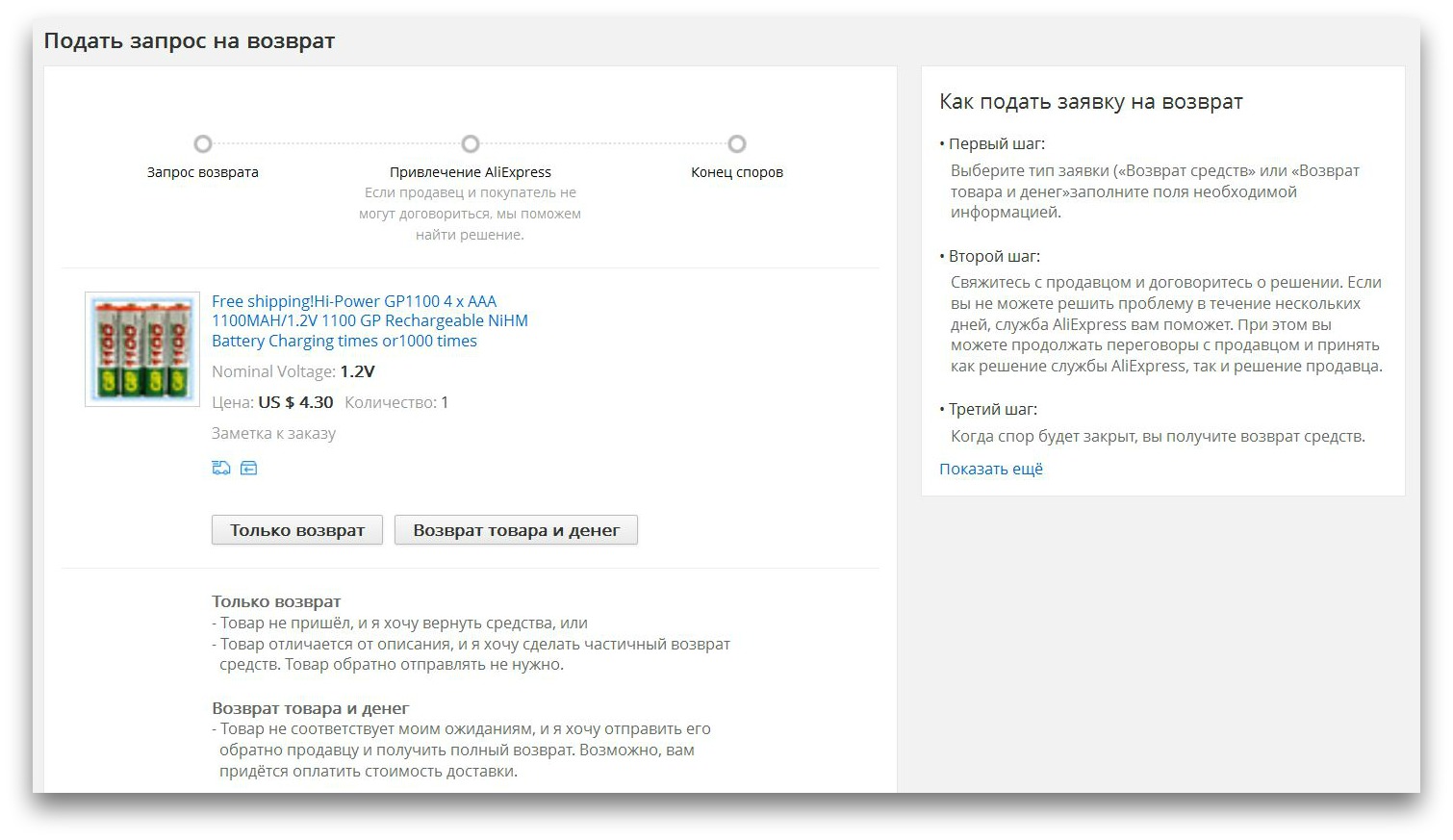 - Выбрать между двумя вариантами – «Только возврат» («Refund Only», возмещение средств без обратной отправки предмета продавцу) или «Возврат товара и денег» («Return Goods», взаимный обмен, т.е. производитель возвращает человеку деньги, а тот ему – посылку). Пользователям из стран СНГ не рекомендуется выбирать последнее предложение потому, что доставка в Азию будет оплачиваться за счет потребителя. Обычно она оказывается дорогой и стоит свыше $20, в то время как процесс по ее отмене является сложным и запутанным.