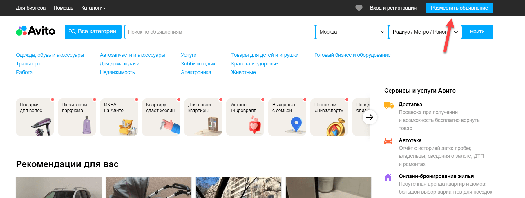 В правом верхнем углу главной страницы есть кнопка «Разместить объявление» — нажмите на нее.