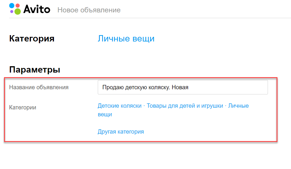 На следующем этапе укажите название объявления. Например, «Продаю детскую коляску. Новая».
