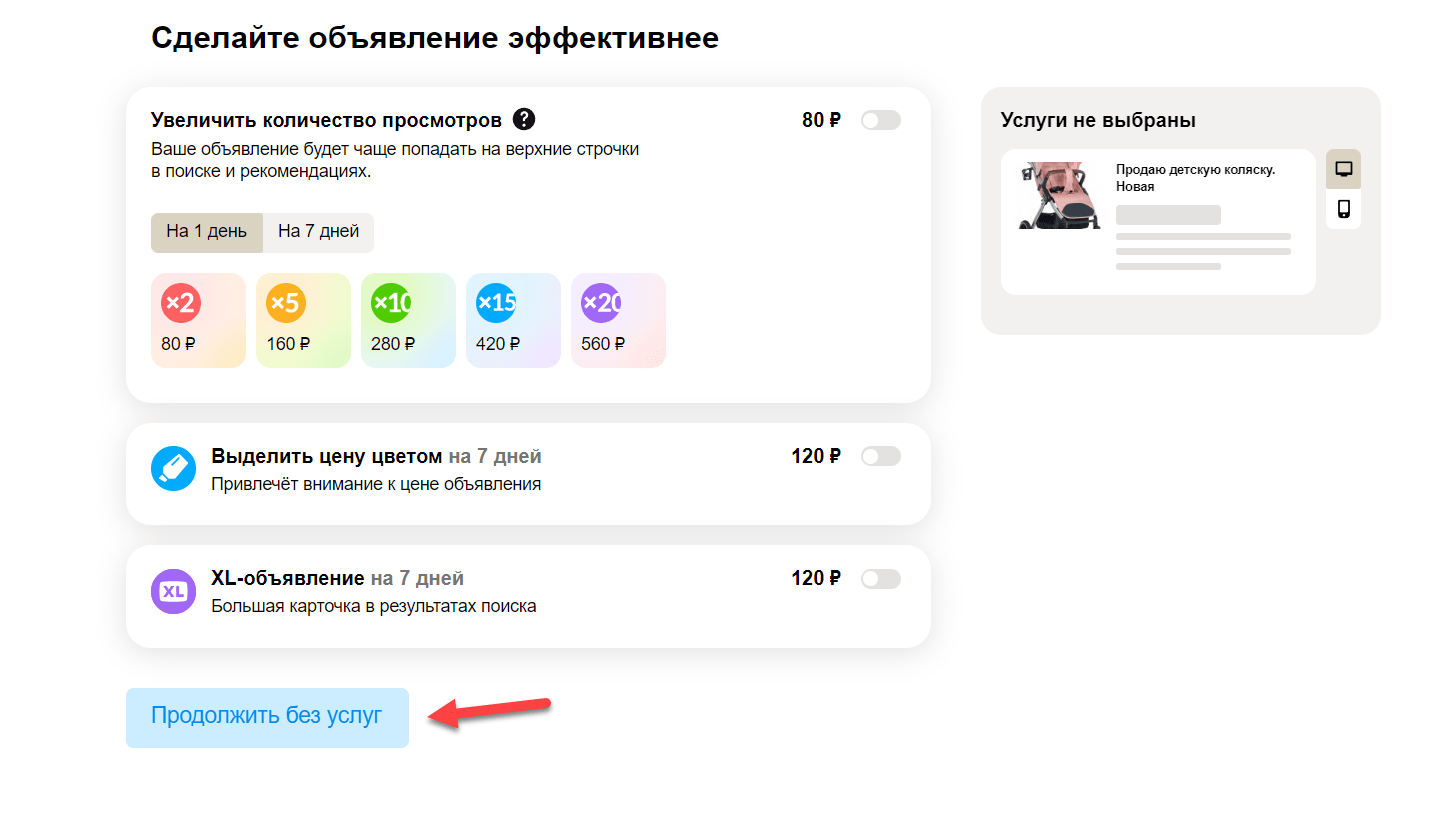 Откроется раздел «Сделайте объявление эффективнее». Это платные услуги, которые помогут увеличить эффективность объявления.