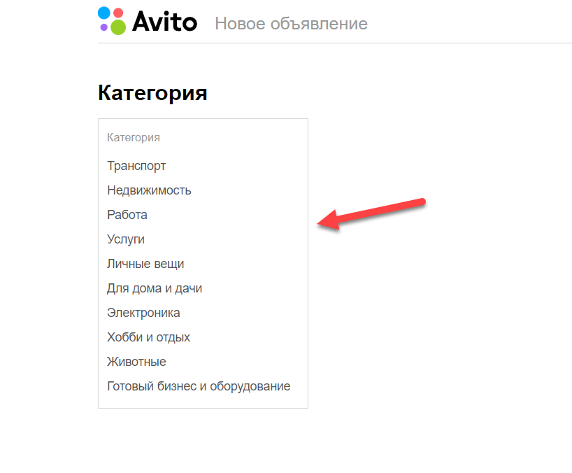 Сразу после регистрации вы попадете в раздел «Новое объявление». Первым делом выберите категорию объявления: например, «Транспорт», «Недвижимость», «Работа», «Услуги».