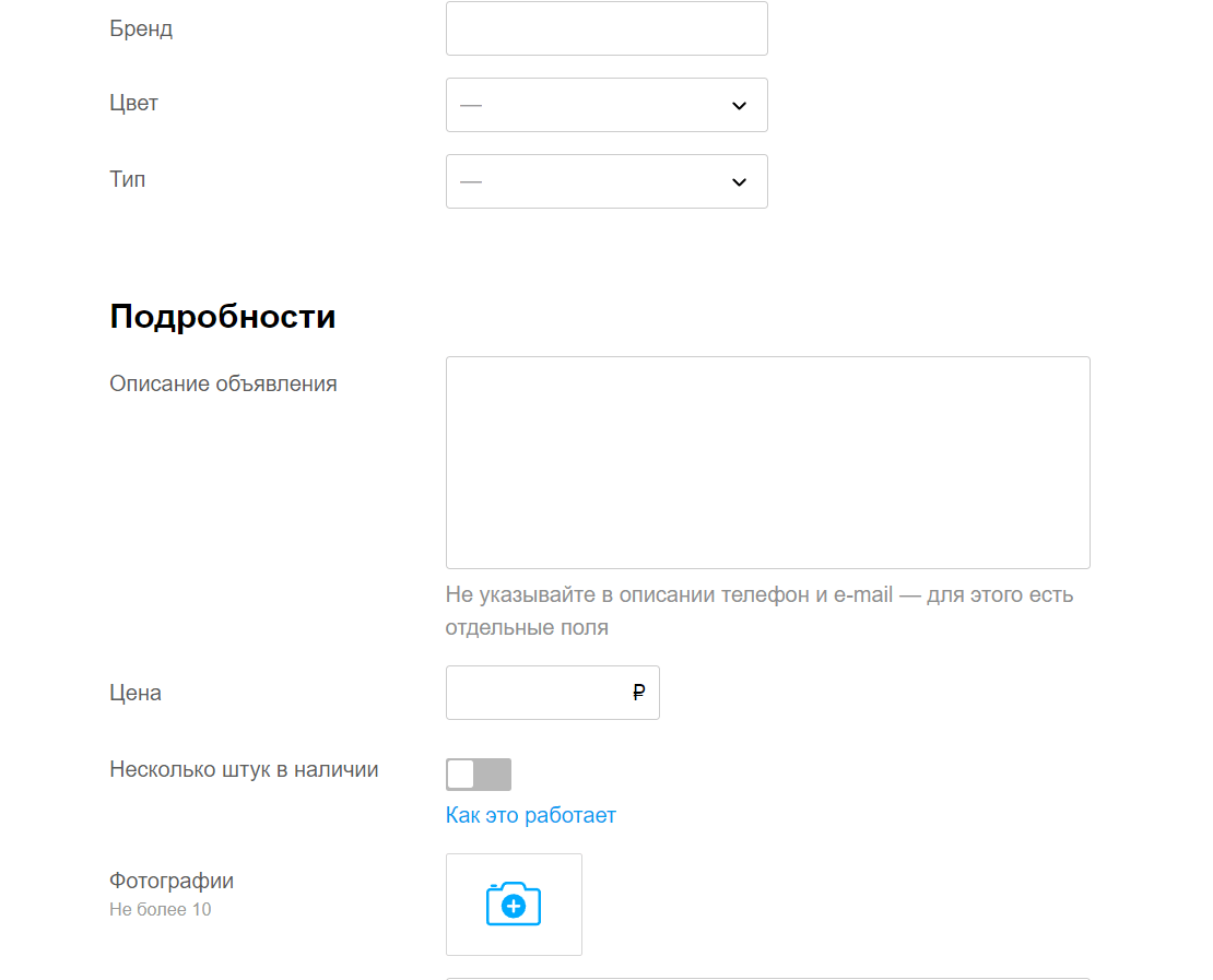 Дальше начинается этап с детальными настройками объявления: укажите подробную информацию о вашем товаре/недвижимости/услуге. Параметры зависят от того, в какой категории вы размещаете объявление.