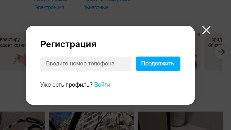Если у вас нет аккаунта на Авито, то нажмите кнопку «Зарегистрироваться».
