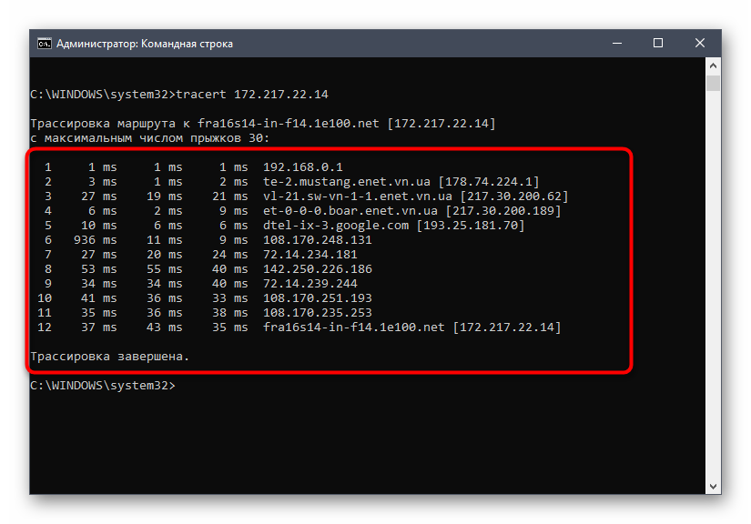 Сразу же после этого начнется трассировка маршрута с определенным количеством прыжков. Не закрывайте консоль до окончания этого процесса, поскольку тогда весь прогресс будет сброшен.