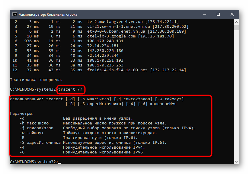 Точно по такому же принципу, как это было и с предыдущей утилитой, функционирует команда tracert /?. Она отображает дополнительные параметры, которые можно присвоить средству во время запуска маршрутизации. Используйте их по необходимости, например, когда требуется задать максимальное число прыжков.