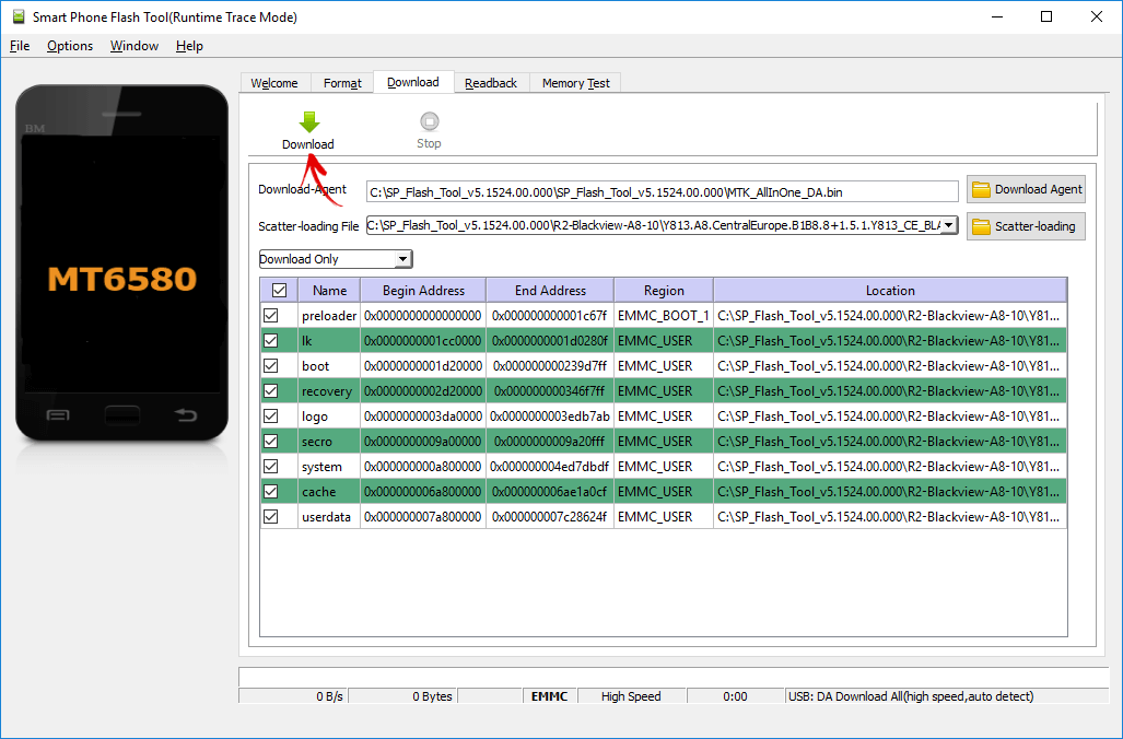 4. Переключатель оставляем на «Download Only» и отмечаем какие разделы нужно прошить (по умолчанию выделены все).