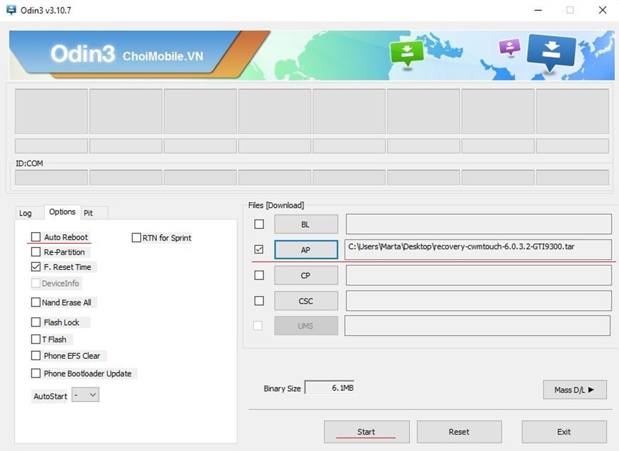 - Снимаете галочку с “Auto Reboot» и нажимаете “AP”, выбираете скачанный архив с TWRP Recovery и жмите старт.