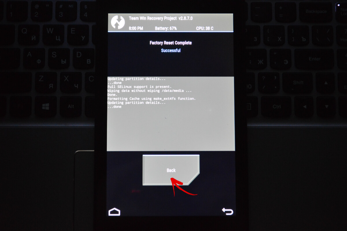 5. По завершению очистки смартфона, планшета нажмите кнопку «Back».