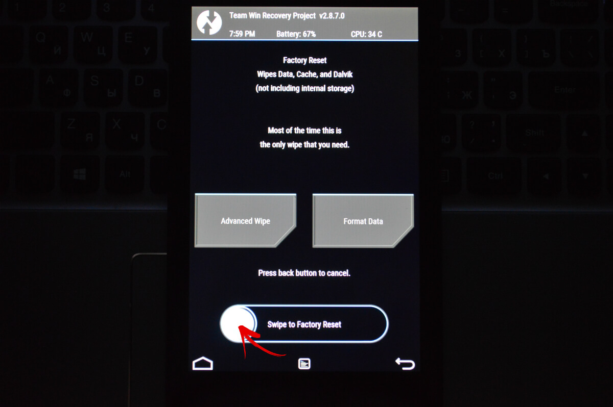 - Свайпните для очистки (это восстановит установленную прошивку в изначальное состояние, и удалит приложения/настройки, которые могут быть несовместимы с прошивкой, которую вы хотите установить).